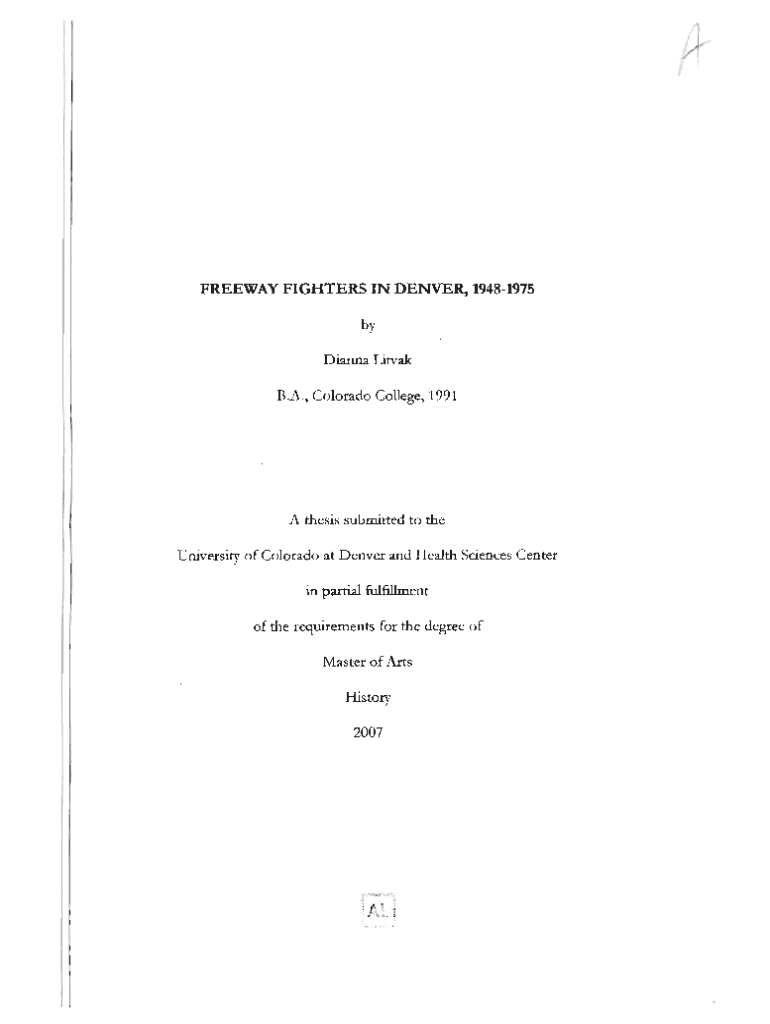FREEWAY FIGHTERS IN DENVER, 19481975 byDianna Litvak B.A., Colorado College, 1991A thesis submitted to the University of Colorado at Denver and Health Sciences Center in partial fulfillmentof the
