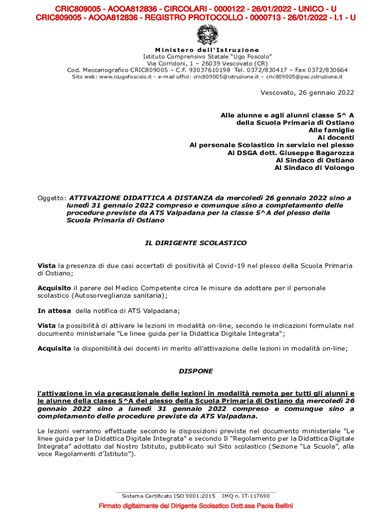 CRIC809005 AOOA812836 CIRCOLARI 0000122 26/01/2022 UNICO U CRIC809005 AOOA812836 REGISTRO PROTOCOLLO 0000713 26/01/2022 I.1 UMinistero dellIstruzione Istituto Comprensivo Statale Ugo Foscolo Via Corridoni,