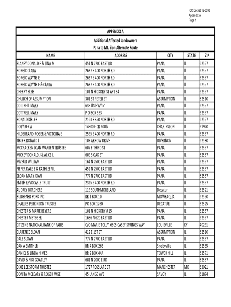 ICC Docket 120598 Appendix A Page 1APPENDIXANAME BLANEYDONALDF&TINAM BORGICCLARA BORGICWAYNEE BORGICWAYNEE&CLARA CHERRYELSIE CHURCHOFASSUMPTION COTTRELLMARY COTTRELLMARY RONALDKIBLER DOTYREXA HILDEBRANDROGER&VICTORIAE