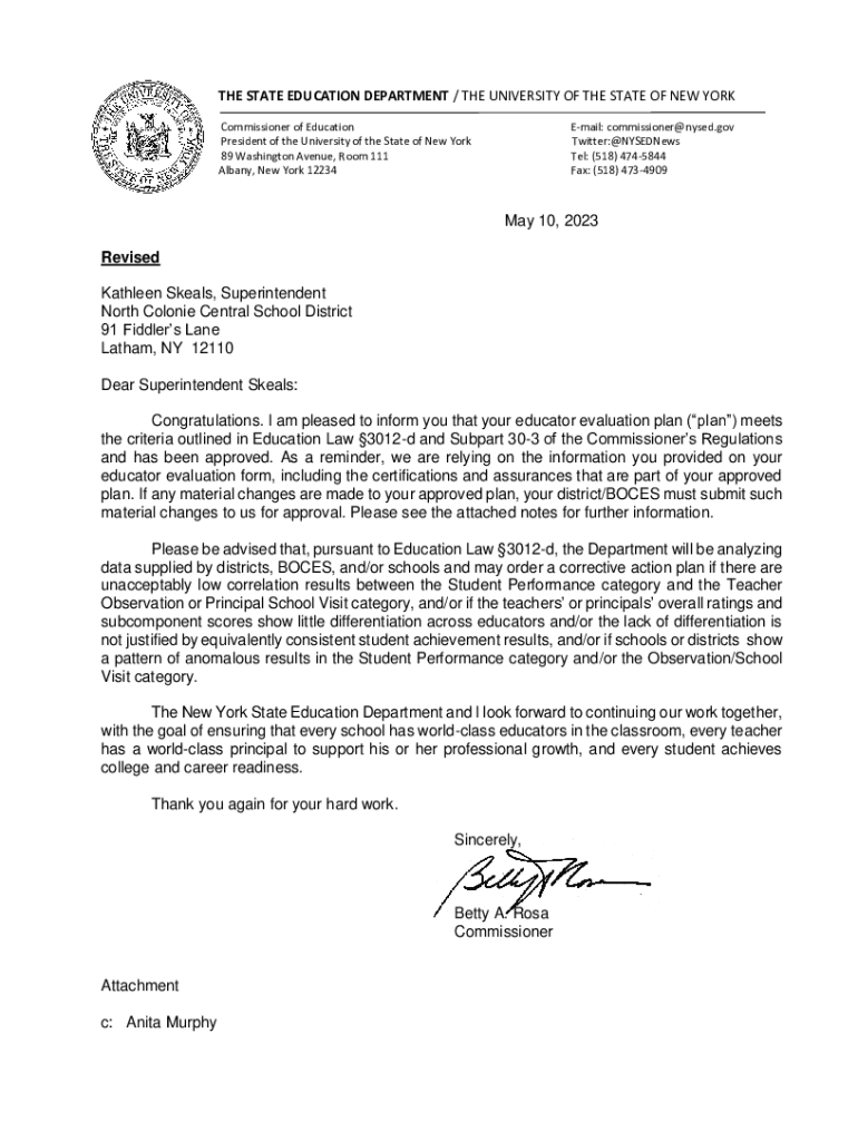 THE STATE EDUCATION DEPARTMENT / THE UNIVERSITY OF THE STATE OF NEW YORK Commissioner of Education President of the University of the State of New York 89 Washington Avenue, Room 111 Albany, New York