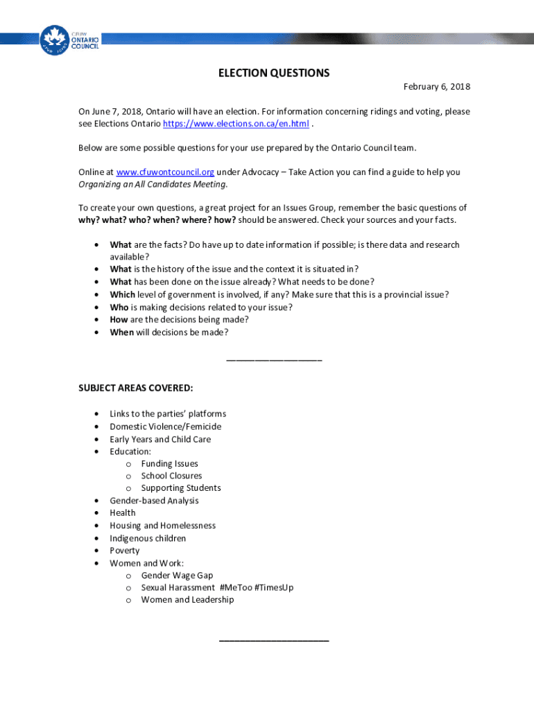 ELECTIONQUESTIONS February6,2018 OnJune7,2018,Ontariowillhaveanelection.Forinformationconcerningridingsandvoting,please seeElectionsOntariohttps://www.elections.on.ca/en.html. BelowaresomepossiblequestionsforyourusepreparedbytheOntarioCouncilteam.