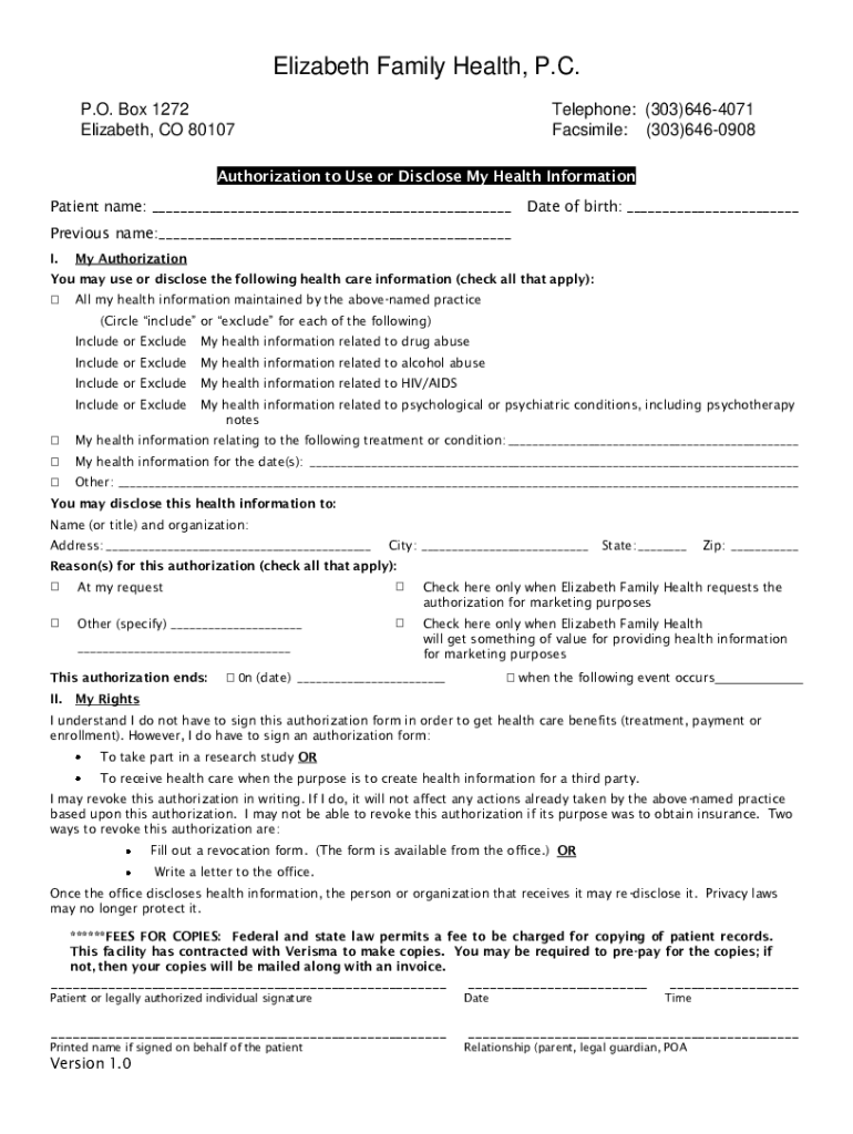 Elizabeth Family Health, P.C. P.O. Box 1272 Elizabeth, CO 80107Telephone: (303)6464071 Facsimile: (303)6460908Authorization to Use or Disclose My Health Information Patient name: ___Date of birth: