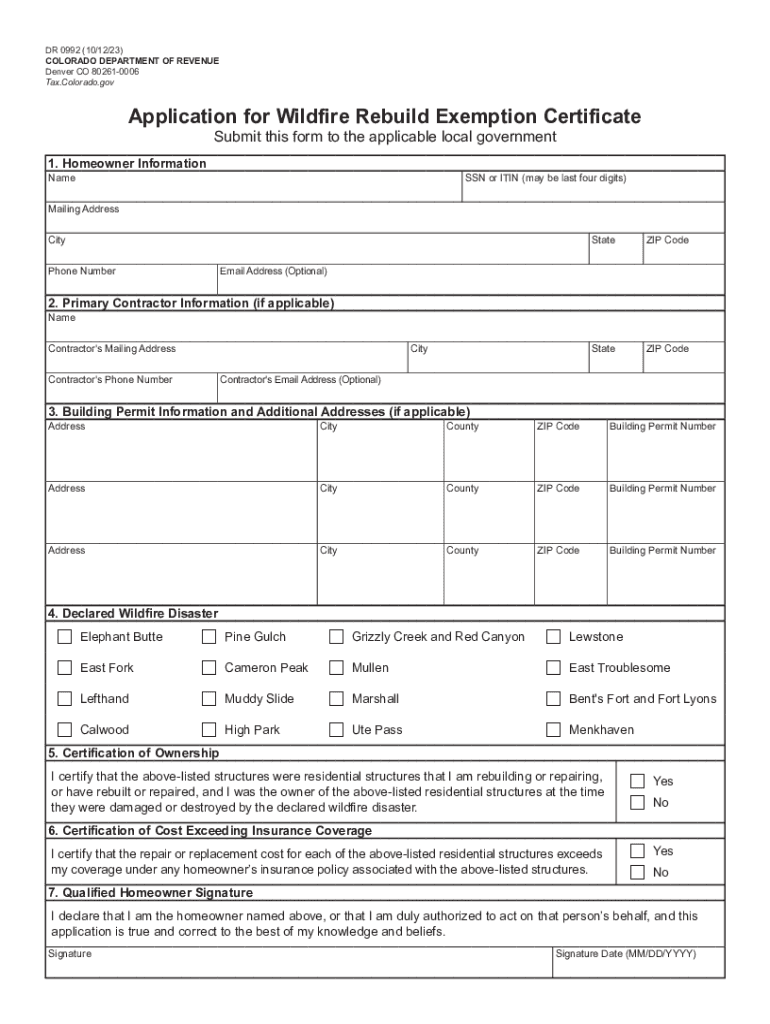 DR 0992 (10/12/23) COLORADO DEPARTMENT OF REVENUE Denver CO 802610006 Tax.Colorado.govApplication for Wildfire Rebuild Exemption Certificate InstructionsGeneral Instructions Qualified homeowners are