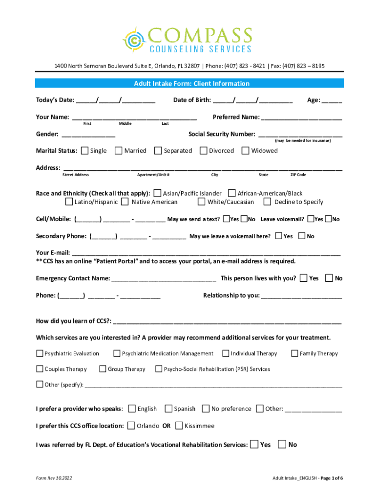 1400 North Semoran Boulevard Suite E, Orlando, FL 32807 | Phone: (407) 823 8421 | Fax: (407) 823 8195Adult Intake Form: Client Information Todays Date: ___/___/___Date of Birth: ___/___/___Your Name: