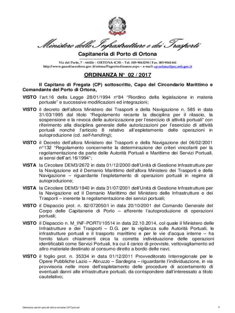Ministero delle Infrastrutture e dei Trasporti Capitaneria di Porto di Ortona Via del Porto, 7 66026 ORTONA (CH) Tel. 0859063290 / Fax. 0859061461 http://www.guardiacostiera.gov.it/ortona/Pages/ordinanze.aspx