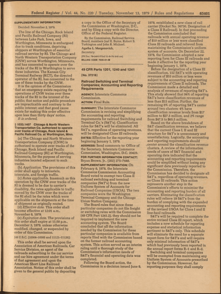 Federal Register / V ol. 44, No. 220 / T u esd ay, N ovem ber 13, 1979 / R ules and R egulations SUPPLEM EN TAR Y INFOR M ATION:Decided: November 2,1979.The line of the Chicago, Rock Island and Pacific