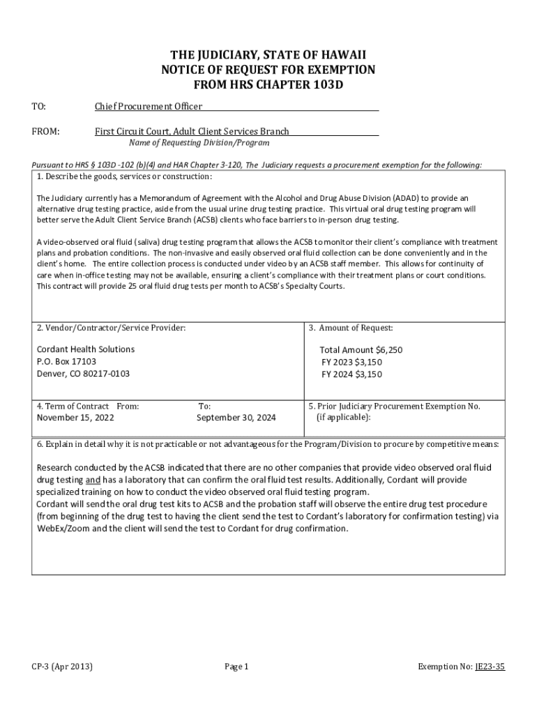 THE JUDICIARY, STATE OF HAWAII NOTICE OF REQUEST FOR EXEMPTION FROM HRS CHAPTER 103D TO:Chief Procurement OfficerFROM:First Circuit Court, Adult Client Services Branch Name of Requesting Division/ProgramPursuant