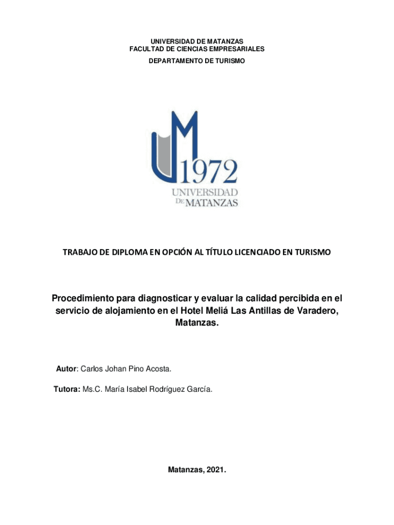 UNIVERSIDAD DE MATANZAS FACULTAD DE CIENCIAS EMPRESARIALES DEPARTAMENTO DE TURISMOTRABAJO DE DIPLOMA EN OPCIN AL TTULO LICENCIADO EN TURISMOProcedimiento para diagnosticar y evaluar la calidad percibida