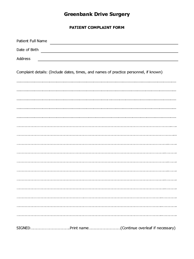 Greenbank Drive Surgery PATIENT COMPLAINT FORM Patient Full Name Date of Birth Address Complaint details: (Include dates, times, and names of practice personnel, if known) .......................................................................................................................................