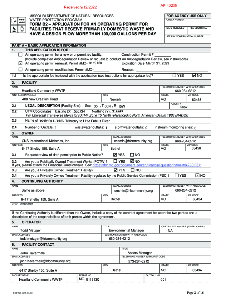 STATE OF MISSOURIDEPARTMENT OF NATURAL RESOURCES MISSOURI CLEAN WATER COMMISSIONMISSOURI STATE OPERATING PERMIT In compliance with the Missouri Clean Water Law (Chapter 644 RSMo, hereinafter, the