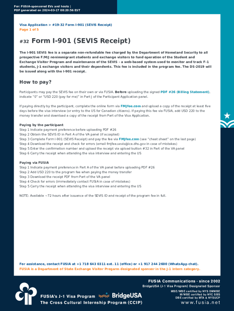 For: FUSIAsponsored EVs and hosts | PDF generated on 20240317 08:20:56 ESTVisa Application #1932 Form I901 (SEVIS Receipt) Page 1 of 5#32Form I901 (SEVIS Receipt)The I901 SEVIS fee is a separate nonrefundable
