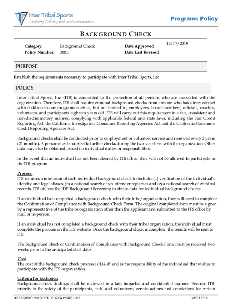 Inter Tribal SportsPrograms PolicyUnifying Tribal youth and communitiesB ACKGROUND C HECK Category: Policy Number:Background Check 300.1Date Approved: Date Last Revised:12/17/2019PURPOSE Establish