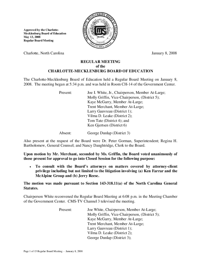 Approved by the CharlotteMecklenburg Board of Education May 13, 2008 Regular Board MeetingCharlotte, North CarolinaJanuary 8, 2008REGULAR MEETING of the CHARLOTTEMECKLENBURG BOARD OF EDUCATION The