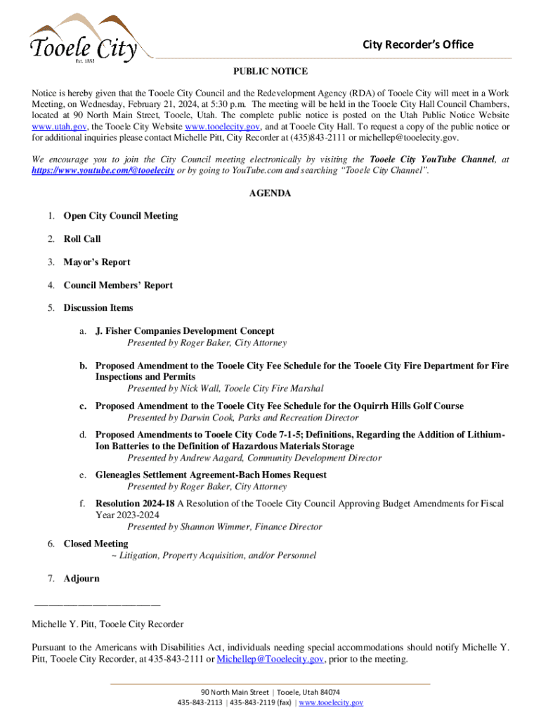 PUBLIC NOTICECity Recorders Office DepartmentNotice is hereby given that the Tooele City Council and the Redevelopment Agency (RDA) of Tooele City will meet in a Work Meeting, on Wednesday, February