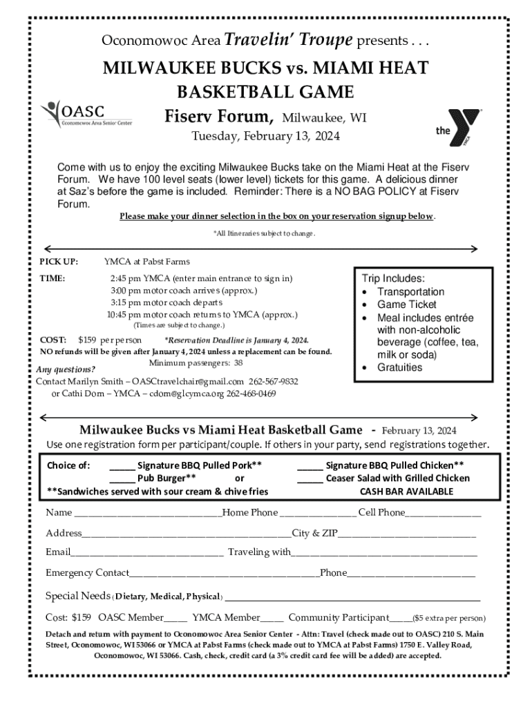 Oconomowoc Area TravelinTroupe presents . . .MILWAUKEE BUCKS vs. MIAMI HEAT BASKETBALL GAME Fiserv Forum, Milwaukee, WI Tuesday, February 13, 2024 Come with us to enjoy the exciting Milwaukee Bucks