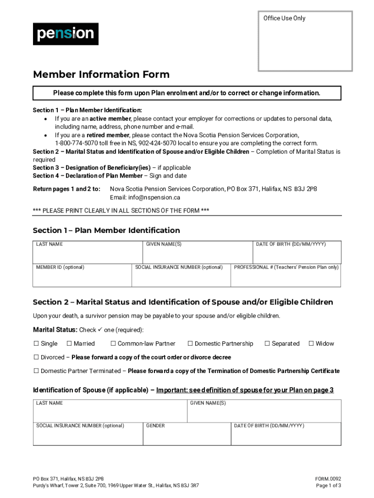 Office Use OnlyMember Information Form Please complete this form upon Plan enrolment and/or to correct or change information. Section 1 Plan Member Identification: If you are an active member, please