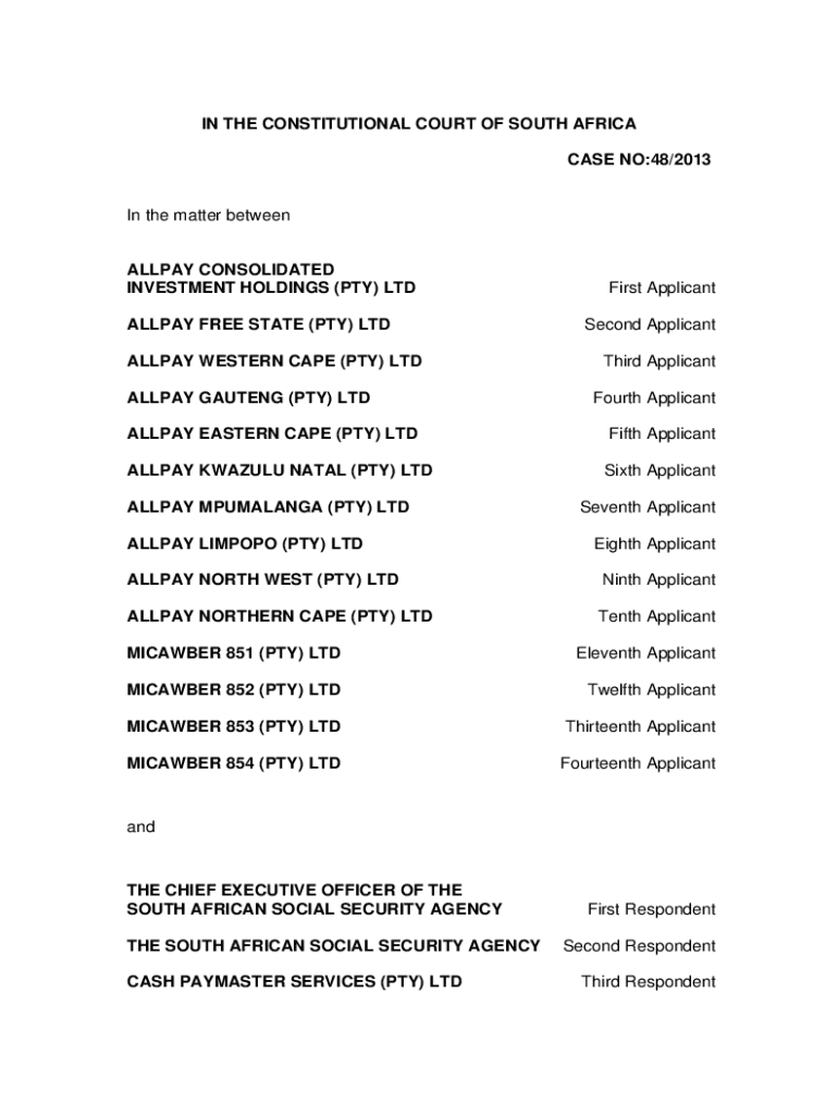 IN THE CONSTITUTIONAL COURT OF SOUTH AFRICA CASE NO:48/2013In the matter betweenALLPAY CONSOLIDATED INVESTMENT HOLDINGS (PTY) LTD ALLPAY FREE STATE (PTY) LTD ALLPAY WESTERN CAPE (PTY) LTD ALLPAY GAUTENG