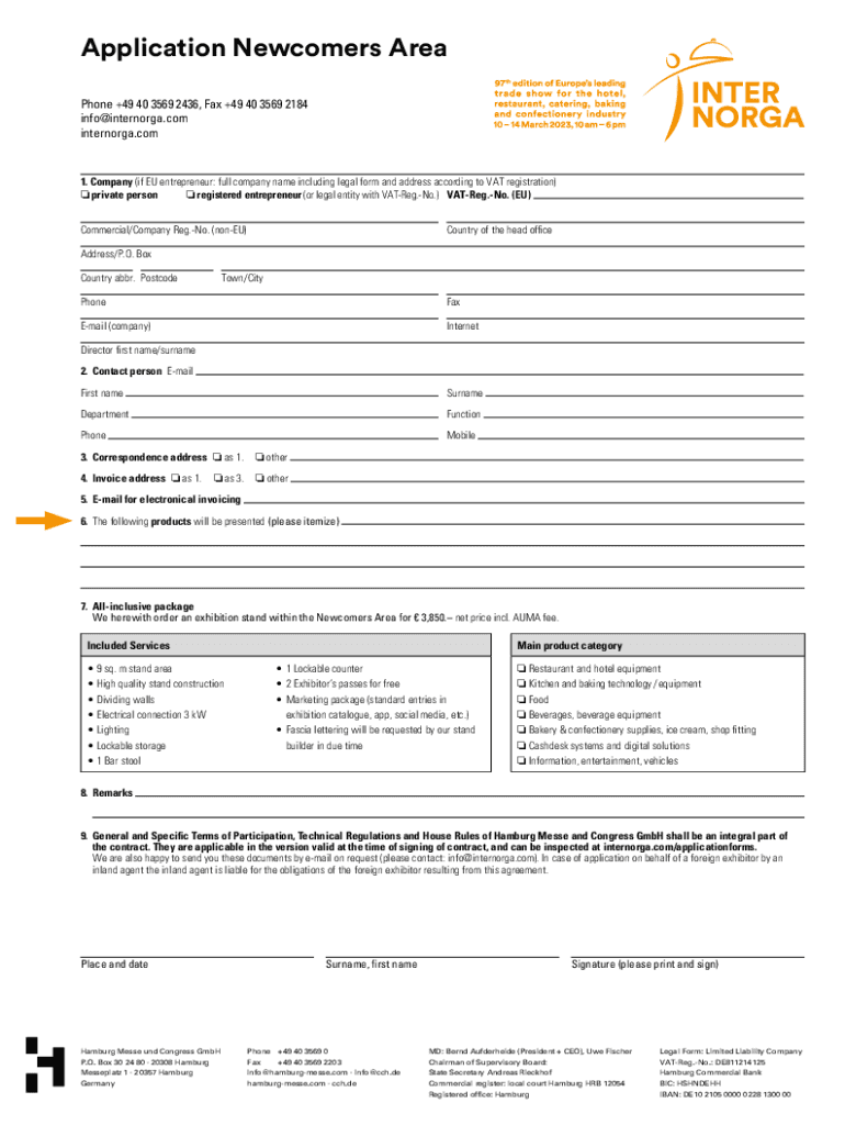 Application Newcomers Area Phone +49 40 3569 2436, Fax +49 40 3569 2184 info@internorga.com internorga.com1. Company (if EU entrepreneur: full company name including legal form and address according