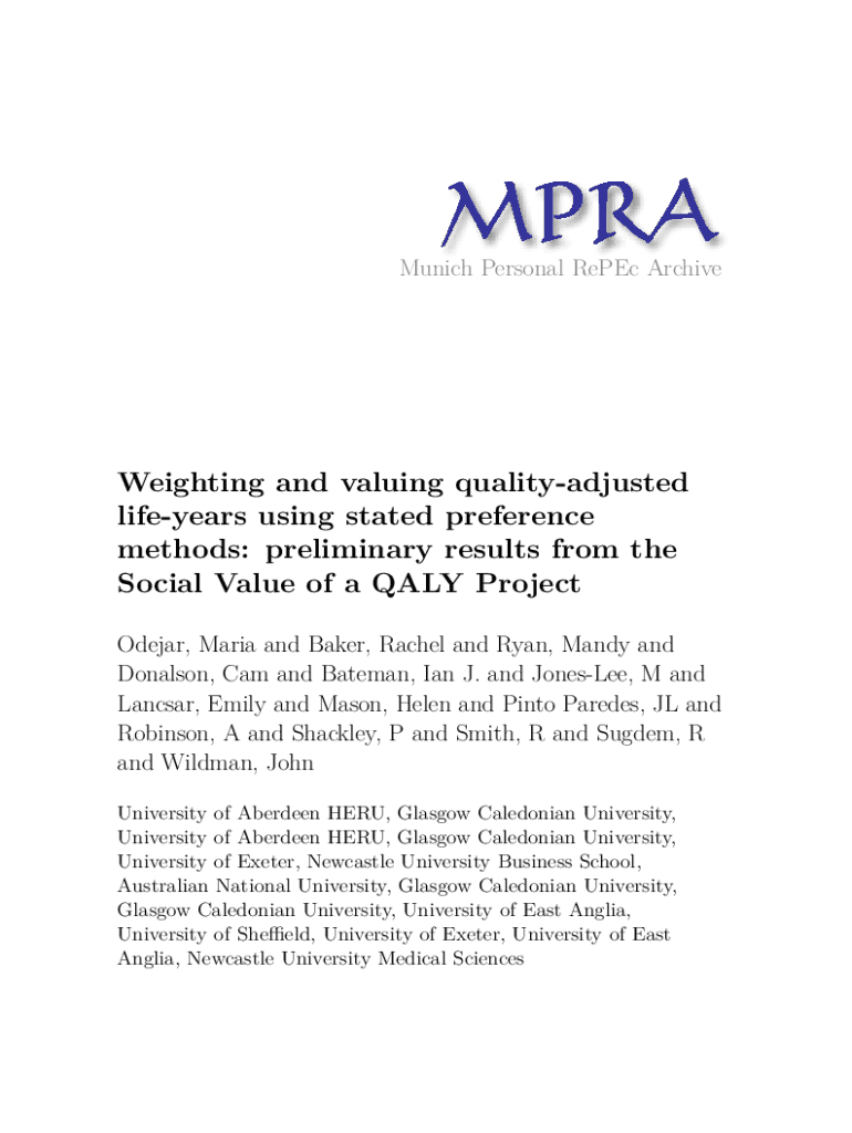Munich Personal RePEc ArchiveWeighting and valuing qualityadjusted lifeyears using stated preference methods: preliminary results from the Social Value of a QALY Project Odejar, Maria and Baker, Rachel