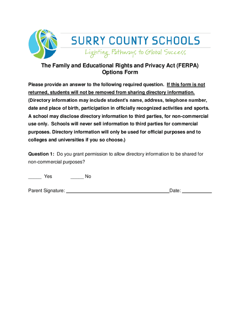 The Family and Educational Rights and Privacy Act (FERPA) Options Form Please provide an answer to the following required question. If this form is not returned, students will not be removed from
