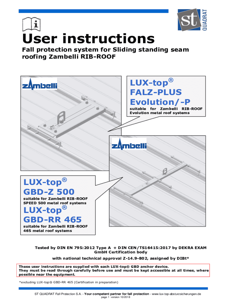 User instructions Fall protection system for Sliding standing seam roofing Zambelli RIBROOFLUXtop FALZPLUS Evolution/P suitable for Zambelli RIBROOF Evolution metal roof systemsLUXtop GBDZ 500 suitable