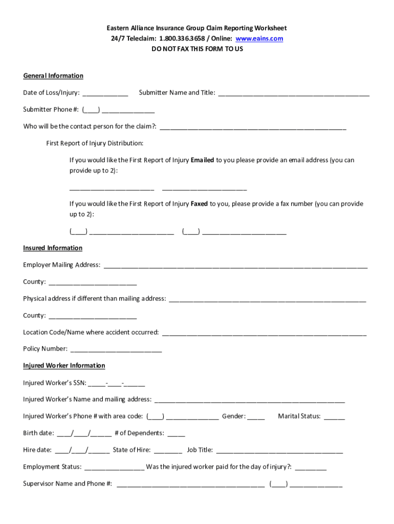 Eastern Alliance Insurance Group Claim Reporting Worksheet 24/7 Teleclaim: 1.800.336.3658 / Online: www.eains.com DO NOT FAX THIS FORM TO USGeneral Information Date of Loss/Injury: ___Submitter Name