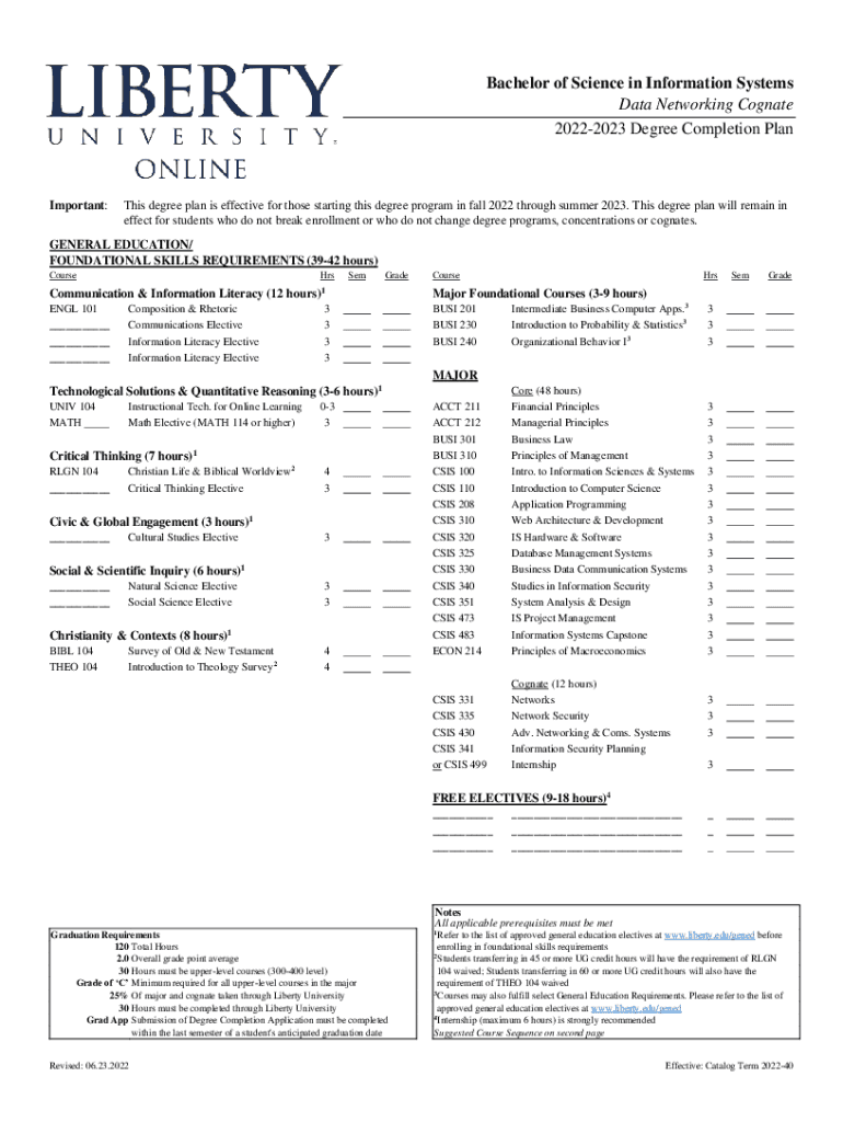 Bachelor of Science in Information Systems Data Networking Cognate 20222023 Degree Completion PlanImportant:This degree plan is effective for those starting this degree program in fall 2022 through