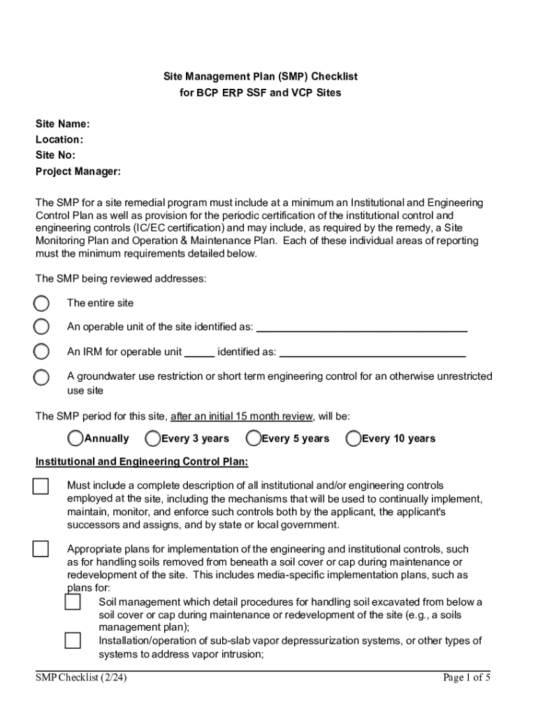 Site Management Plan (SMP) Checklist for BCP ERP SSF and VCP Sites Site Name: Location: Site No: Project Manager: The SMP for a site remedial program must include at a minimum an Institutional and
