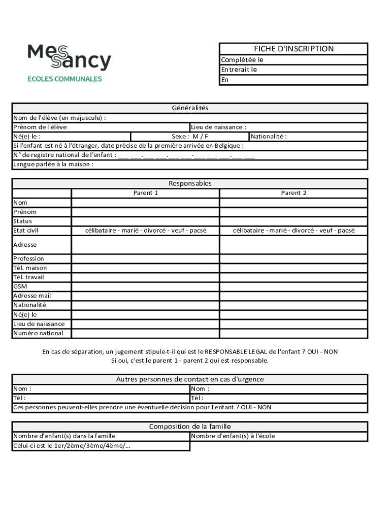 FICHE D\'INSCRIPTION Complte le Entrerait le EnGnralits Nom de l\'lve (en majuscule) : Prnom de l\'lve Lieu de naissance : N(e) le : Sexe : M / F Nationalit : Si l\'enfant est n l\'tranger, date prcise
