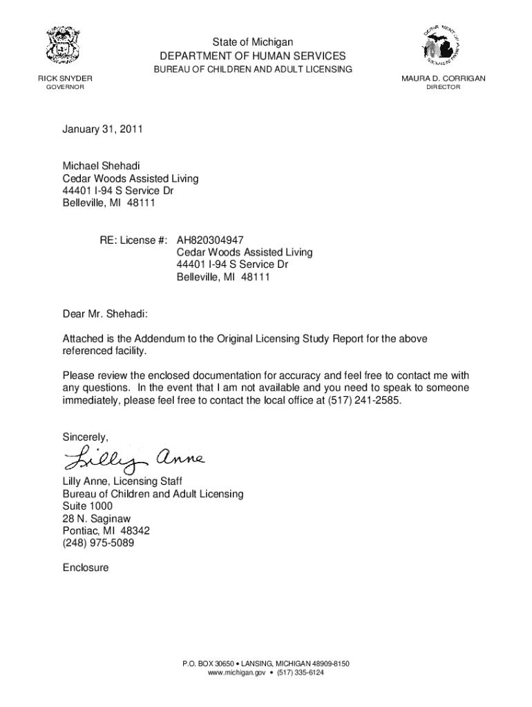 State of Michigan DEPARTMENT OF HUMAN SERVICES BUREAU OF CHILDREN AND ADULT LICENSING RICK SNYDERMAURA D. CORRIGANGOVERNORDIRECTORJanuary 31, 2011Michael Shehadi Cedar Woods Assisted Living 44401