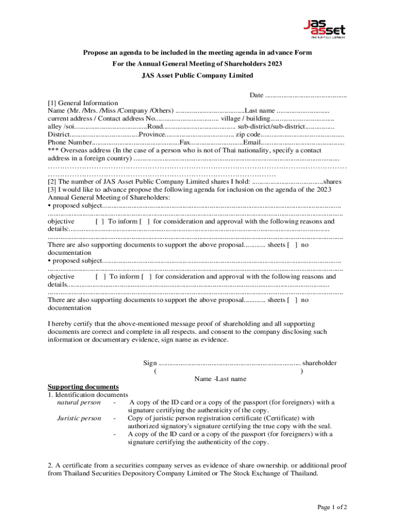 Propose an agenda to be included in the meeting agenda in advance Form For the Annual General Meeting of Shareholders 2023 JAS Asset Public Company Limited Date .............................................