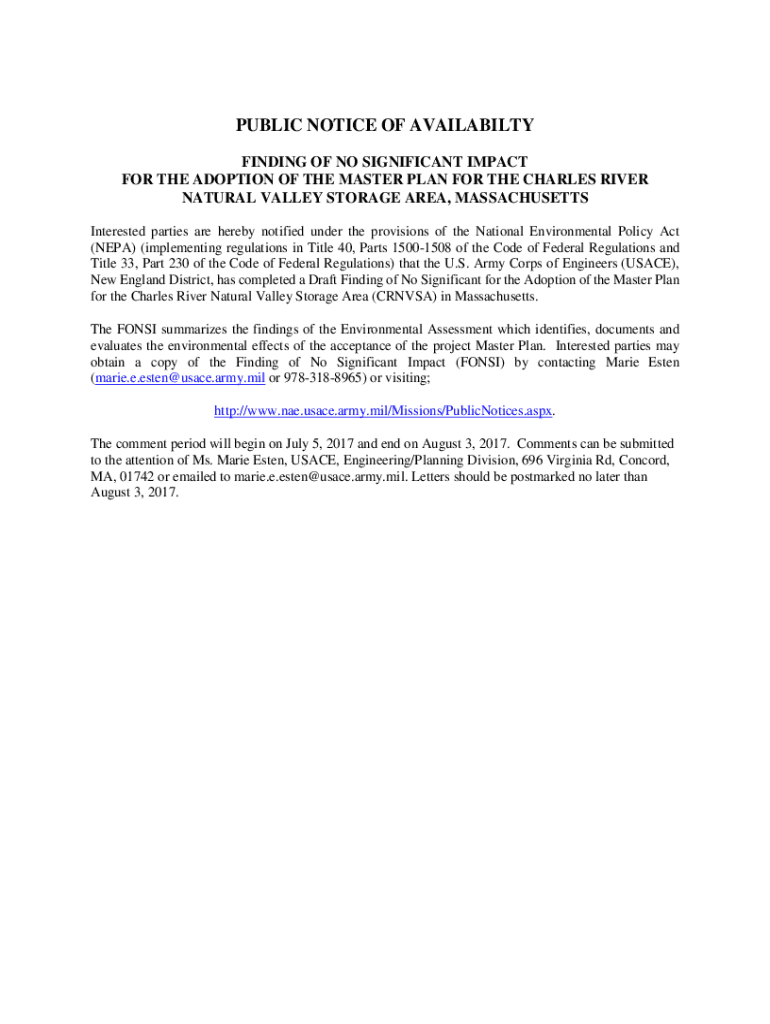 PUBLIC NOTICE OF AVAILABILTY FINDING OF NO SIGNIFICANT IMPACT FOR THE ADOPTION OF THE MASTER PLAN FOR THE CHARLES RIVER NATURAL VALLEY STORAGE AREA, MASSACHUSETTS Interested parties are hereby notified