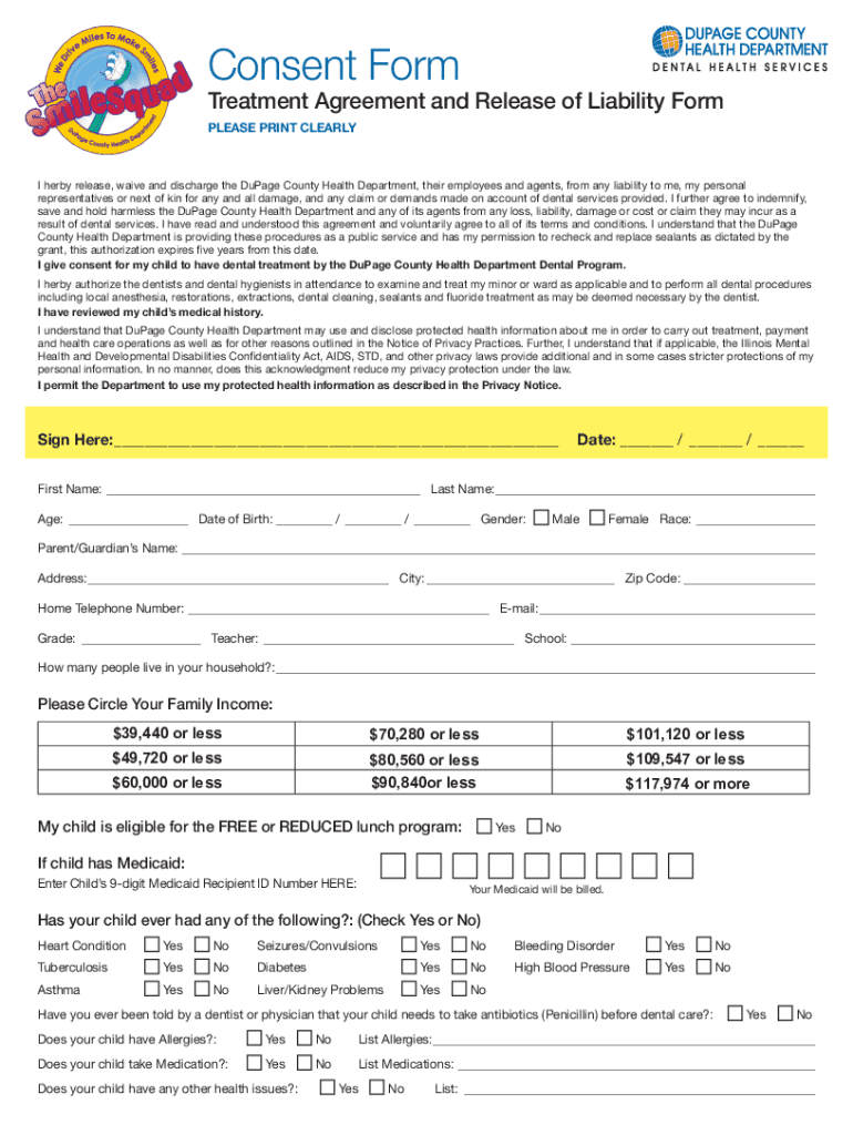 Consent FormTreatment Agreement and Release of Liability Form PLEASE PRINT CLEARLYI herby release, waive and discharge the DuPage County Health Department, their employees and agents, from any liability