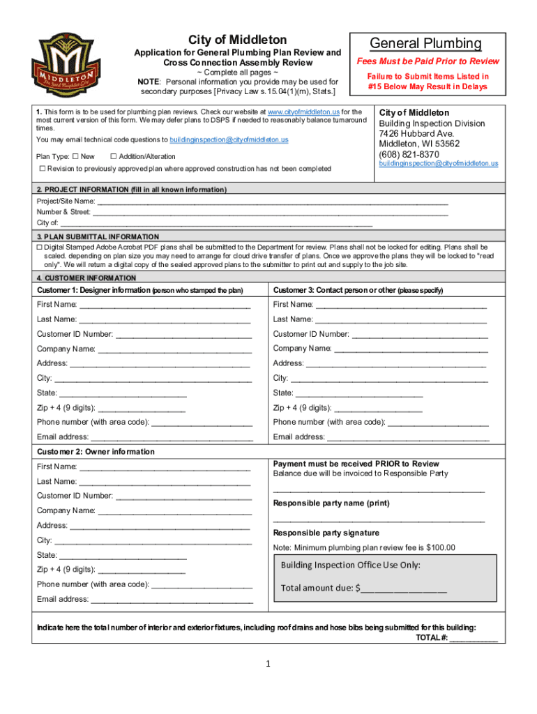 City of MiddletonApplication for General Plumbing Plan Review and Cross Connection Assembly Review Complete all pages NOTE: Personal information you provide may be used for secondary purposes [Privacy