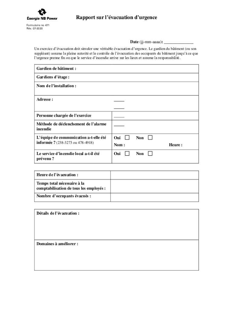 Rapport sur lvacuation durgence Formulaire no 471 Rv. 072020Date (jjmmaaaa): ___ Un exercice dvacuation doit simuler une vritable vacuation durgence. Le gardien du btiment (ou son supplant) assume
