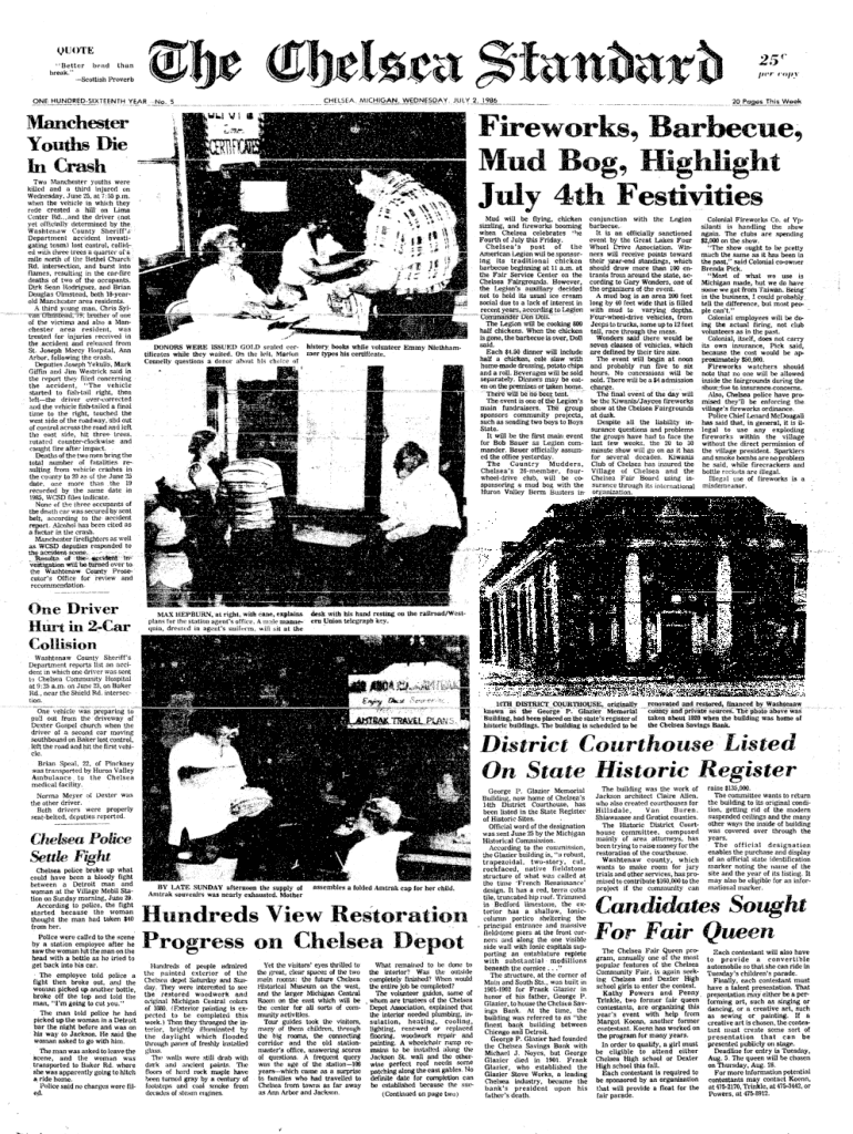 QUOTE11Better bond than break. Scottish Proverbpvr cttftyONE HUNDREDSIXTEENTH YEAR No. 5CHELSEA, MiCHiGAN. WEDNESDAY, JULY2, 1986M anchester Y ouths Die h i C rashF ir e w o r k s , B a r b e c u