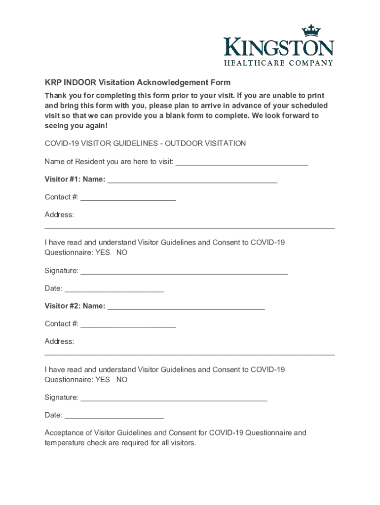 Anyone who wishes to visit a resident in a krp facility indoors needs to fill out the indoor visitation acknowledgement form.