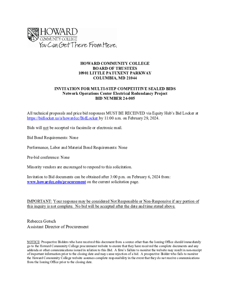 HOWARD COMMUNITY COLLEGE BOARD OF TRUSTEES 10901 LITTLE PATUXENT PARKWAY COLUMBIA, MD 21044 INVITATION FOR MULTISTEP COMPETITIVE SEALED BIDS Network Operations Center Electrical Redundancy Project