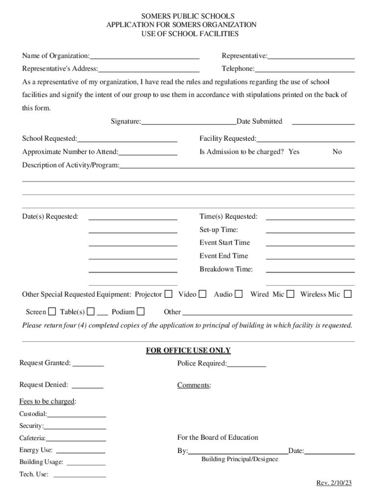 SOMERS PUBLIC SCHOOLS APPLICATION FOR SOMERS ORGANIZATION USE OF SCHOOL FACILITIES Name of Organization:Representative:Representative\'s Address:Telephone:As a representative of my organization, I
