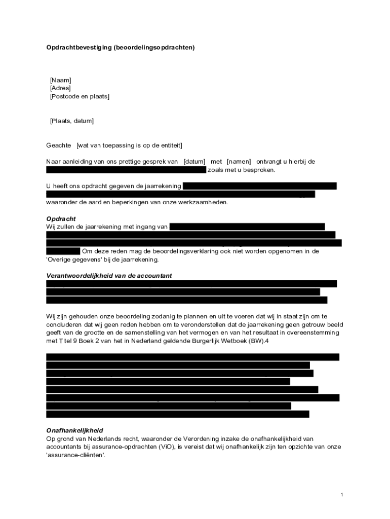 Opdrachtbevestiging (beoordelingsopdrachten)[Naam] [Adres] [Postcode en plaats][Plaats, datum]Geachte [wat van toepassing is op de entiteit] Naar aanleiding van ons prettige gesprek van [datum] met