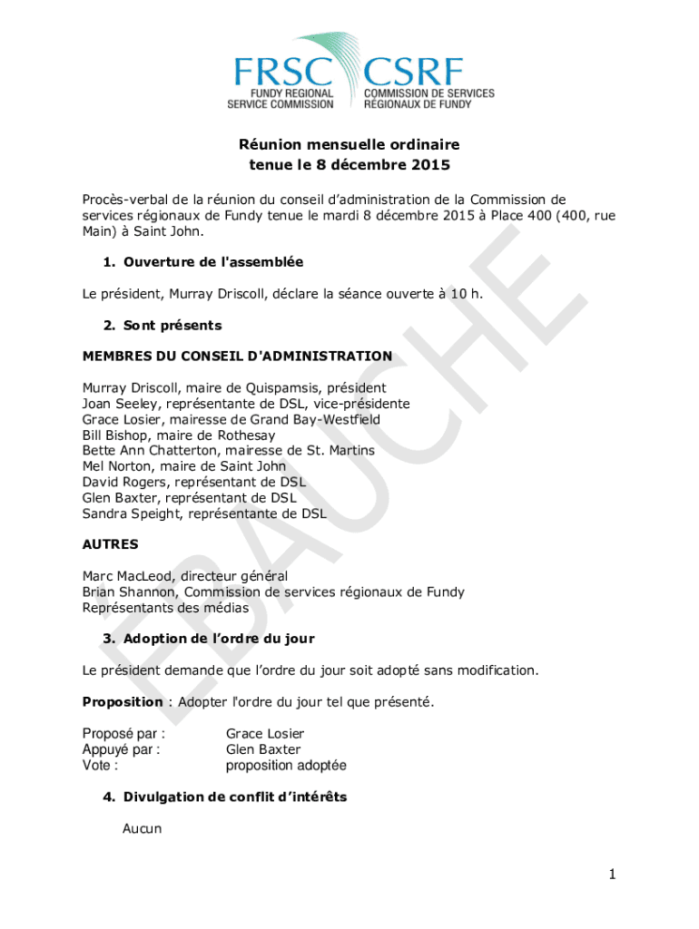 Runion mensuelle ordinaire tenue le 8 dcembre 2015 Procsverbal de la runion du conseil dadministration de la Commission de services rgionaux de Fundy tenue le mardi 8 dcembre 2015 Place 400 (400,