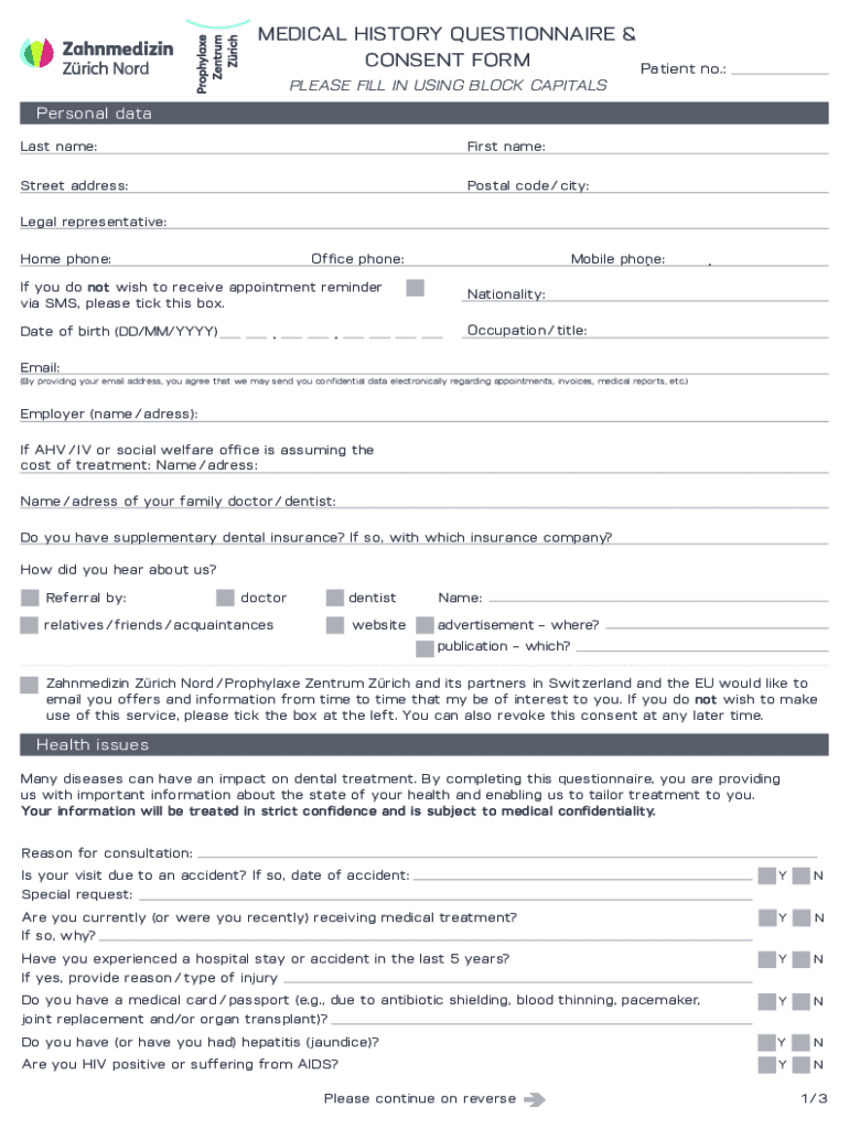 MEDICAL HISTORY QUESTIONNAIRE & CONSENT FORM Patient no.: PLEASE FILL IN USING BLOCK CAPITALSPersonal data Last name:First name:Street address:Postal code/city:Legal representative: Home phone:Office