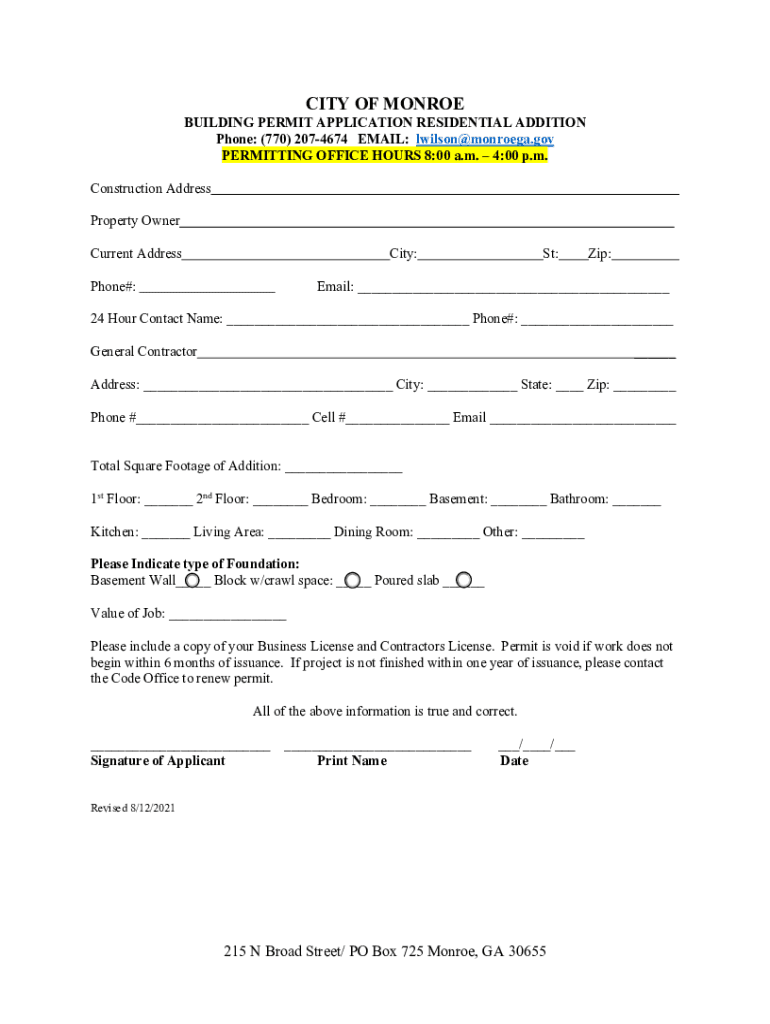 CITY OF MONROEBUILDING PERMIT APPLICATION RESIDENTIAL ADDITION Phone: (770) 2074674 EMAIL: lwilson@monroega.gov PERMITTING OFFICE HOURS 8:00 a.m. 4:00 p.m. Construction Address Property Owner Current