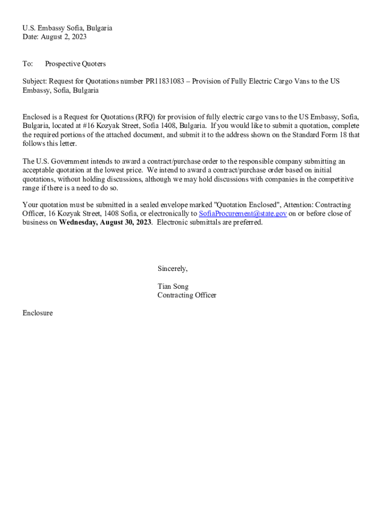 U.S. Embassy Sofia, Bulgaria Date: August 2, 2023 To:Prospective QuotersSubject: Request for Quotations number PR11831083 Provision of Fully Electric Cargo Vans to the US Embassy, Sofia, Bulgaria