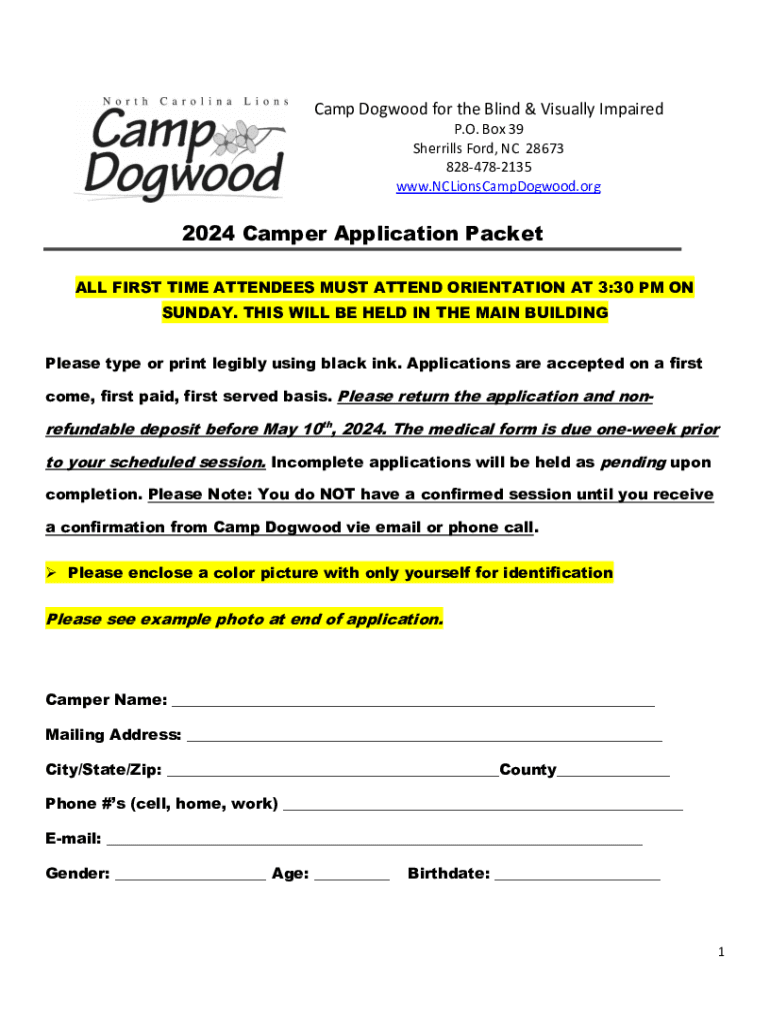 Camp Dogwood for the Blind & Visually Impaired P.O. Box 39 Sherrills Ford, NC 28673 8284782135 www.NCLionsCampDogwood.org2024 Camper Application Packet ALL FIRST TIME ATTENDEES MUST ATTEND ORIENTATION