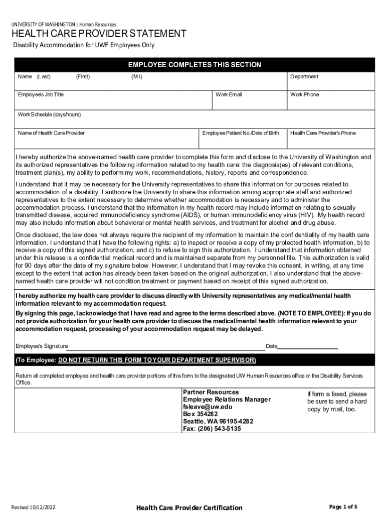 UNIVERSITY OF WASHINGTON | Human ResourcesHEALTH CARE PROVIDER STATEMENT Disability Accommodation for UWF Employees OnlyEMPLOYEE COMPLETES THIS SECTION Name (Last)(First)Employee\'s Job Title(M.I)Department