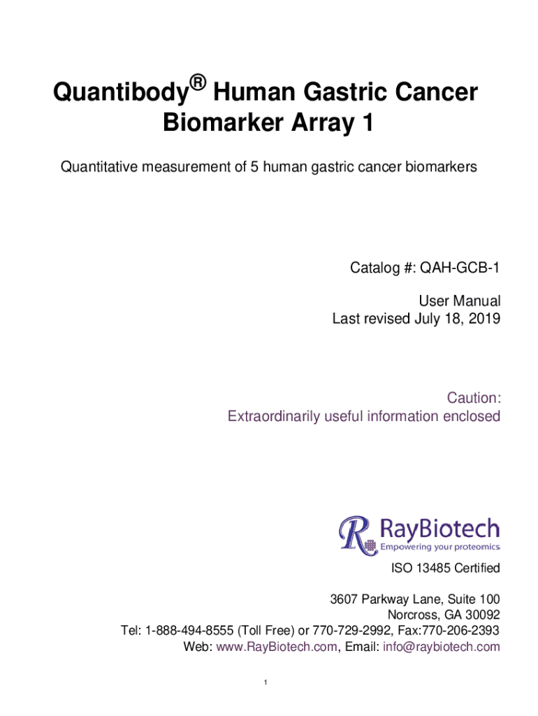 Quantibody Human Gastric Cancer Biomarker Array 1 Quantitative measurement of 5 human gastric cancer biomarkersCatalog #: QAHGCB1 User Manual Last revised July 18, 2019Caution: Extraordinarily useful