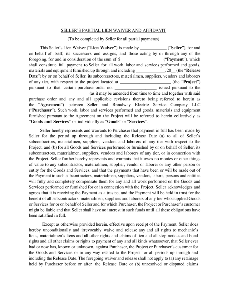 SELLERS PARTIAL LIEN WAIVER AND AFFIDAVIT (To be completed by Seller for all partial payments) This Sellers Lien Waiver (Lien Waiver) is made by ___ (Seller), for and on behalf of itself, its successors