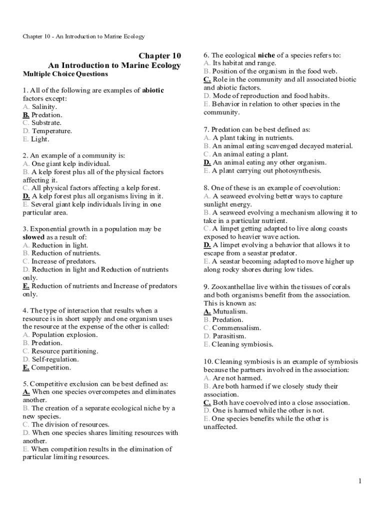 Chapter 10 An Introduction to Marine EcologyChapter 10 An Introduction to Marine Ecology Multiple Choice Questions 1. All of the following are examples of abiotic factors except: A. Salinity. B. Predation.