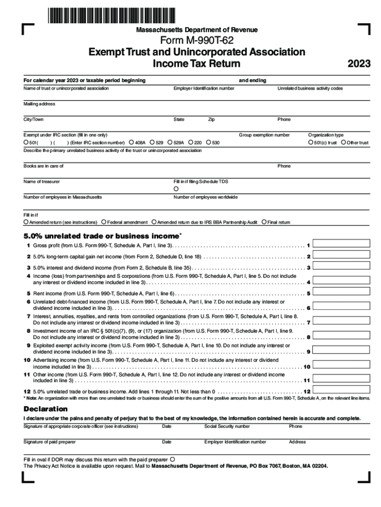 Massachusetts Department of RevenueForm M990T62 Exempt Trust and Unincorporated Association Income Tax Return For calendar year 2023 or taxable period beginningName of trust or unincorporated association2023and